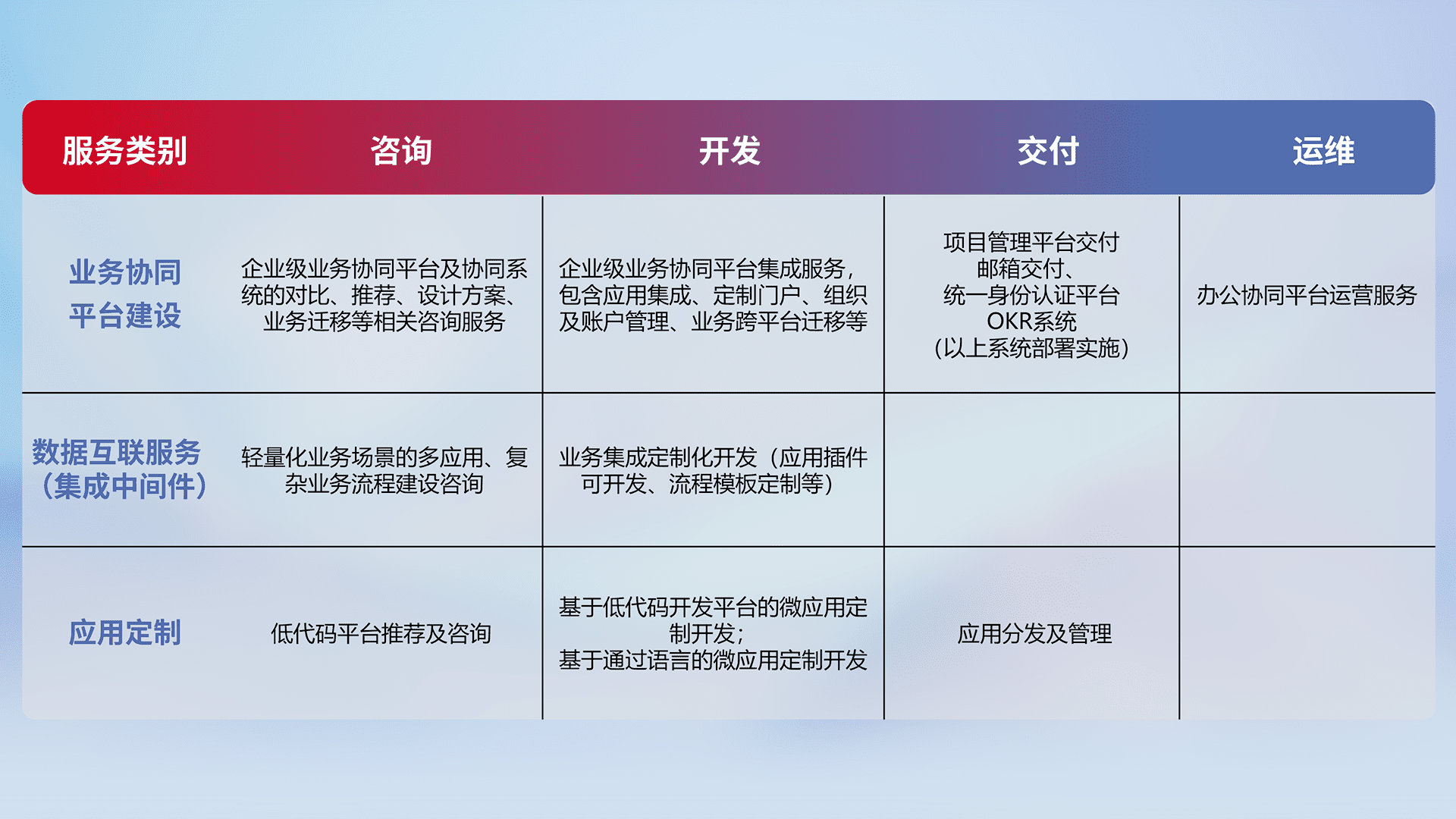 针对钉钉、、、、企微、、、IDaas等平台级产品提供产品的规划、、、、方案、、、、交付、、、定制化开发等服务,,实现如统一协同办公、、智能客户服务、、、混合会议管理、、、、智能数据查询、、等业务场景,,,,实现数字化转型。。